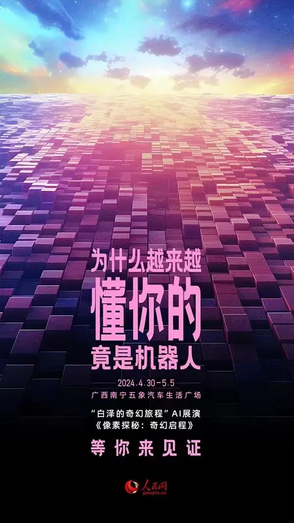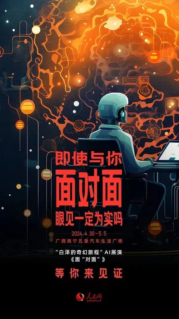 其中,作為此次主題活動(dòng)之一,由人民網(wǎng)自主開發(fā)的國內(nèi)首臺(tái)AI展示體驗(yàn)活動(dòng)《白澤的奇幻旅程》,于4月30日至5月5日,在南寧五象汽車生活廣場(chǎng)面向公眾展演,全方位、多角度、立體化集中呈現(xiàn)當(dāng)前AI在各領(lǐng)域的創(chuàng)新發(fā)展與應(yīng)用成果。