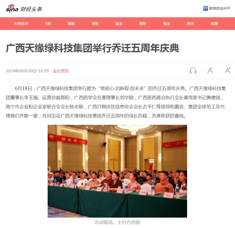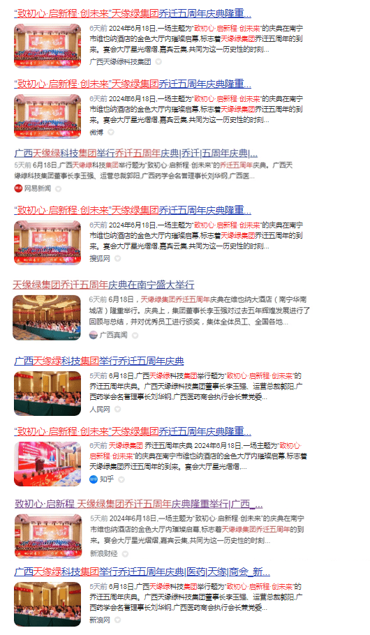 2024年6月18日,廣西天緣綠科技集團在南寧市維也納酒店舉辦了“致初心·啟新程·創(chuàng)未來”喬遷五周年慶典活動,近千人歡聚一堂,共同見證天緣綠集團的成長歷程,共享收獲的喜悅。