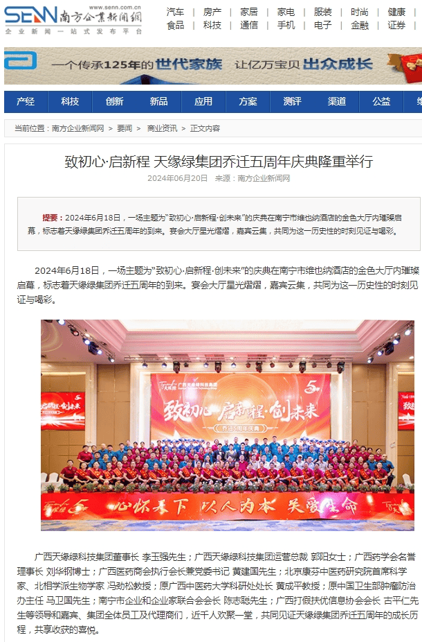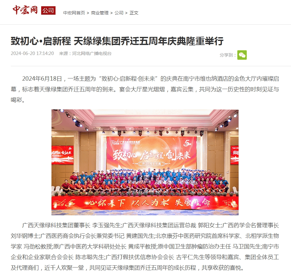 報道細致入微地記錄了天緣綠集團喬遷五周年慶典的盛況,不僅詳盡地回顧了集團喬遷五年來的發(fā)展歷程與輝煌成就,更深入地展現(xiàn)了天緣綠未來發(fā)展的巨大潛力,向公眾呈現(xiàn)了集團作為未來大健康行業(yè)領軍者的風采。