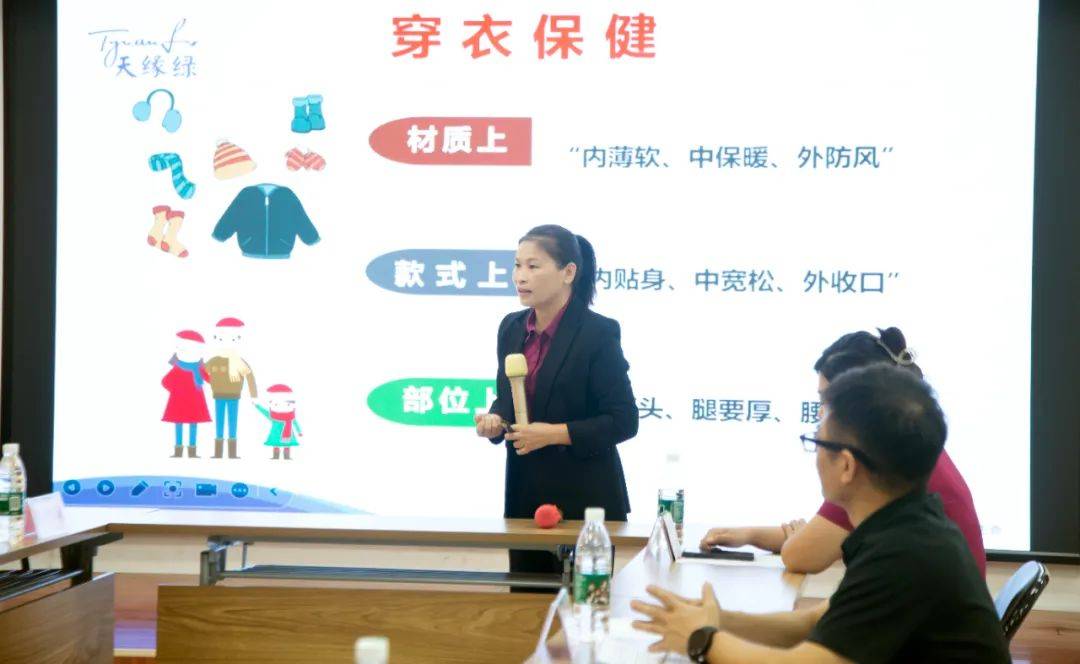 隨后,國家高級健康管理師黃秀森老師作為主講嘉賓,為大家?guī)砹艘粓鼍实亩颈=≈R講座。黃老師憑借豐富的專業(yè)知識和實(shí)踐經(jīng)驗(yàn),深入淺出地講解了冬季常見疾病的種類及預(yù)防措施。她特別強(qiáng)調(diào)了穿衣、飲食、起居、運(yùn)動(dòng)四個(gè)方面在冬季保健中的重要性,并穿插分享了諸多實(shí)用的小技巧,如怎么選擇合適的保暖衣物、冬季男女養(yǎng)腎喝兩湯以及冬季泡腳的注意事項(xiàng)等,這些實(shí)用的知識技巧讓在場的聽眾受益匪淺。