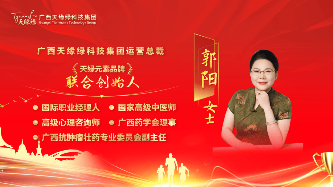 郭陽女士,作為天綠元素品牌聯(lián)合創(chuàng)始人,不僅肩負(fù)著引領(lǐng)品牌發(fā)展的重任,同時(shí)在大健康領(lǐng)域深耕細(xì)作,擔(dān)任著廣西藥學(xué)會(huì)理事、廣西膏方專業(yè)委員會(huì)委員以及廣西抗腫瘤壯藥專業(yè)委員會(huì)副主任等多個(gè)重要職務(wù)。此外,她還擁有國(guó)際職業(yè)經(jīng)理人、高級(jí)心理咨詢師與國(guó)家高級(jí)中醫(yī)師的權(quán)威資質(zhì)。郭陽女士的每一步都堅(jiān)實(shí)而輝煌,不僅要推動(dòng)天綠元素惠及更多人,更要引領(lǐng)團(tuán)隊(duì)實(shí)現(xiàn)“健康他人,成就自己”的企業(yè)愿景,讓每個(gè)人都能在天緣綠實(shí)現(xiàn)自我價(jià)值,共同書寫健康事業(yè)的新篇章。