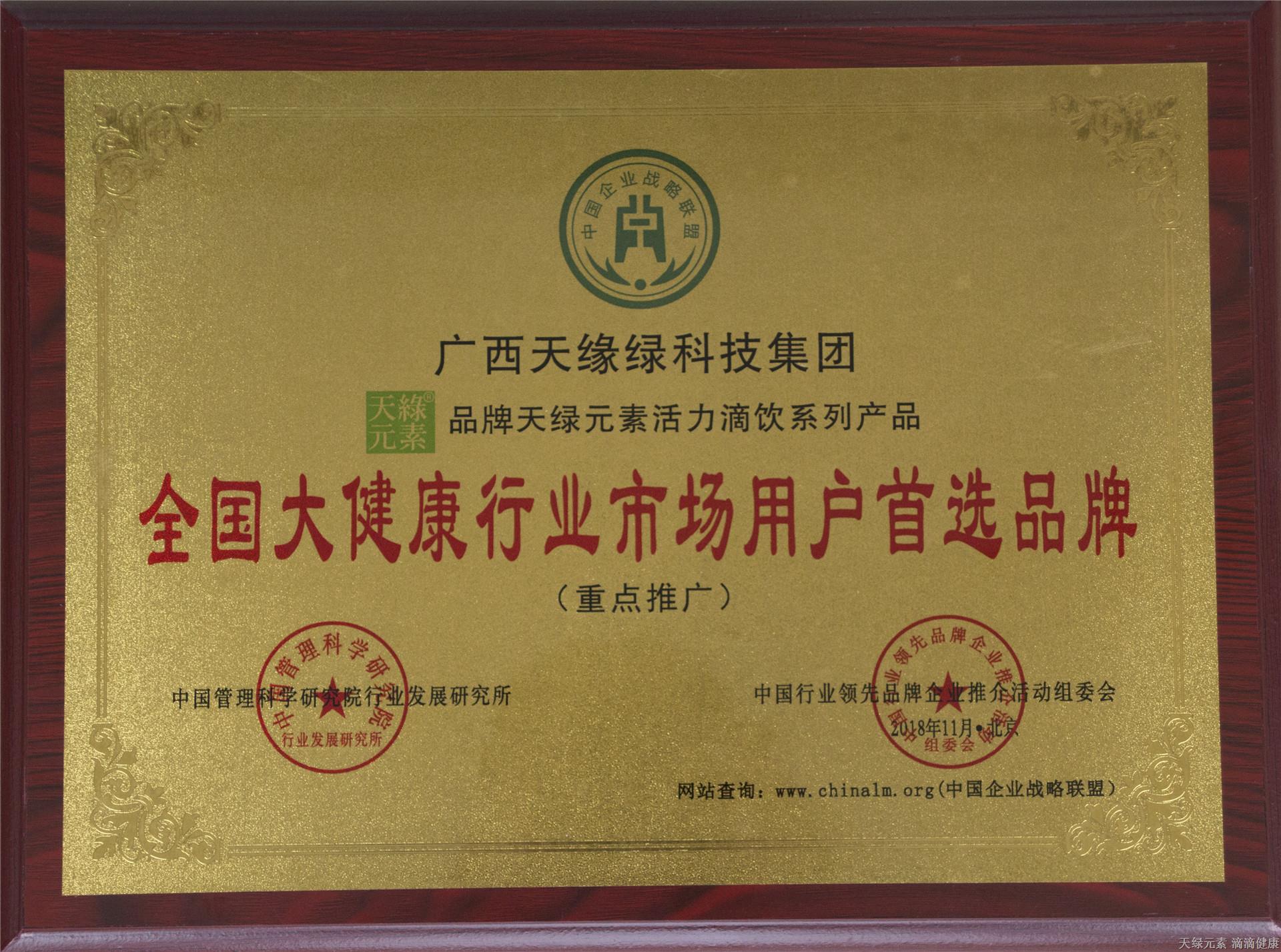 2018年11月, 天緣綠集團(tuán)獲全國大健康行業(yè)市場用戶首選品牌稱號